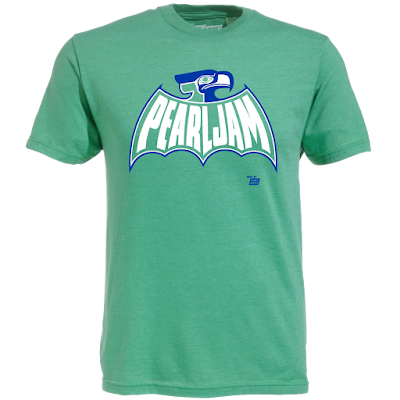 Pearl Jam and Ames Bros are teaming up to support the Seattle Seahawks Kick Hunger Challenge and fight to end hunger. All of the profits from the sale of this awesome “Pearl Jam Bathawk” t-shirt designed by Ames Bros, and inspired by Batman and the Seattle Seahawks, goes straight to the Food Lifeline to help feed the hungry. This killer design is currently available in a variety of styles (including mens, womens and youth t-shirts, a hoodie and a zip-up hoodie) in sizes S-XXL at the Ames Bros online store for $26-60.